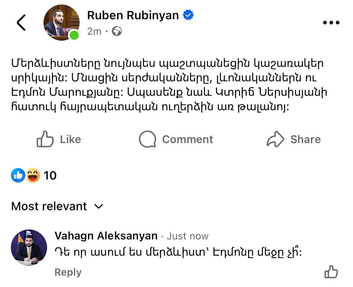 Եթե այդքան արդա՞ր եք՝ մի գրառում էլ արեք ձեր կոռուպցիոն բուրգի մասին։ Մոռացե՞լ եք, որ կոռուպցիոն գործը բացվում է, հետո Հայոց ցեղասպանության ուրացման գործում «մեծագույն ավանդի» դիմաց փակվում։ Հանդարտվեք ու հանգիստ սպասեք ձեր հերթին․ ԱԹՍ-ները ձեր վրա էլ են աշխատում։