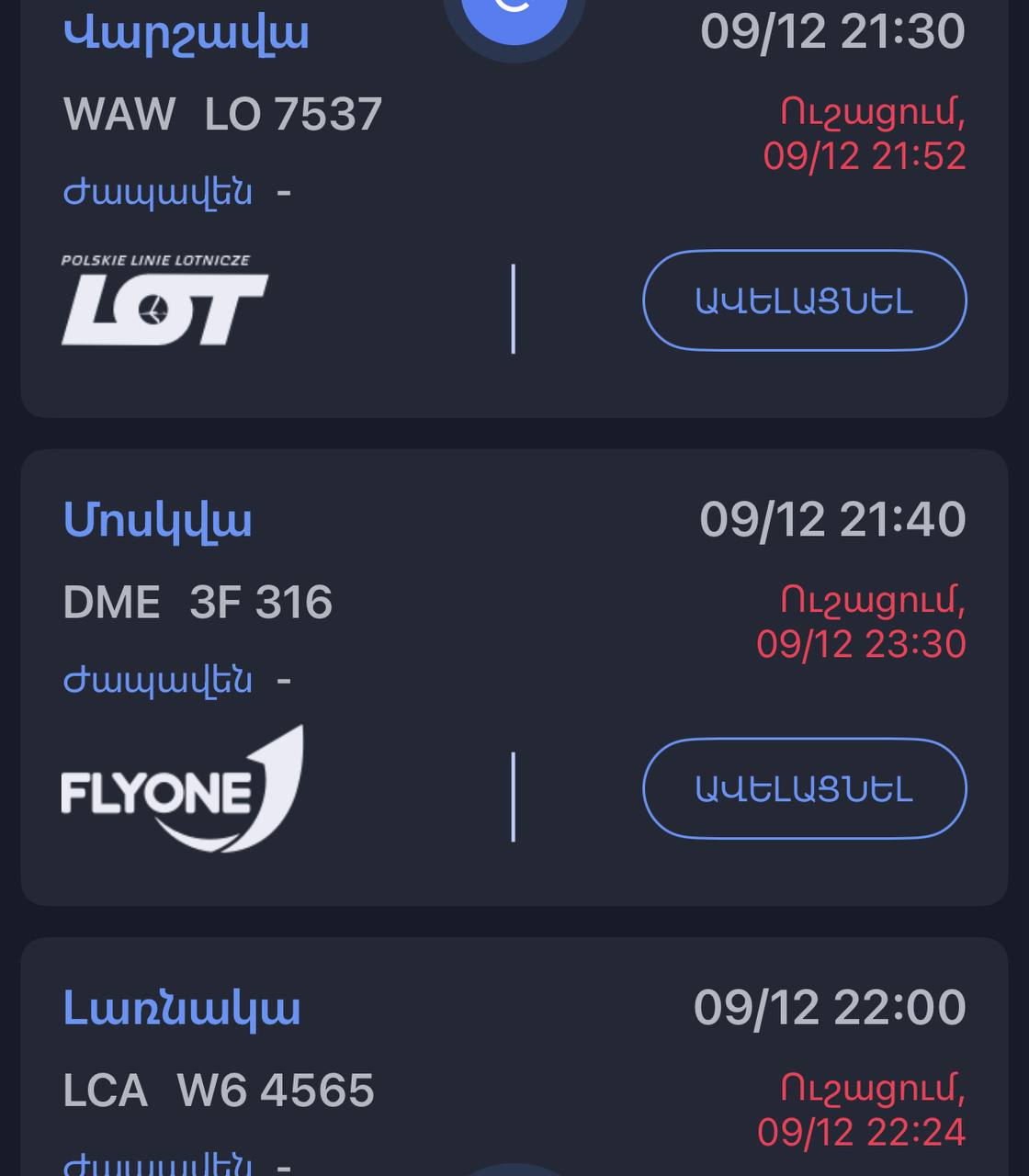 MediaHub-ը փորձեց հասկանալ, որ ուղղությունների մասին է խոսքը: Չվացուցակից պարզ է դառնում, որ ժամանման ուշացումներ են գրանցել Մոսկվա, Վարշավա, Լառնակա ուղղություններով։