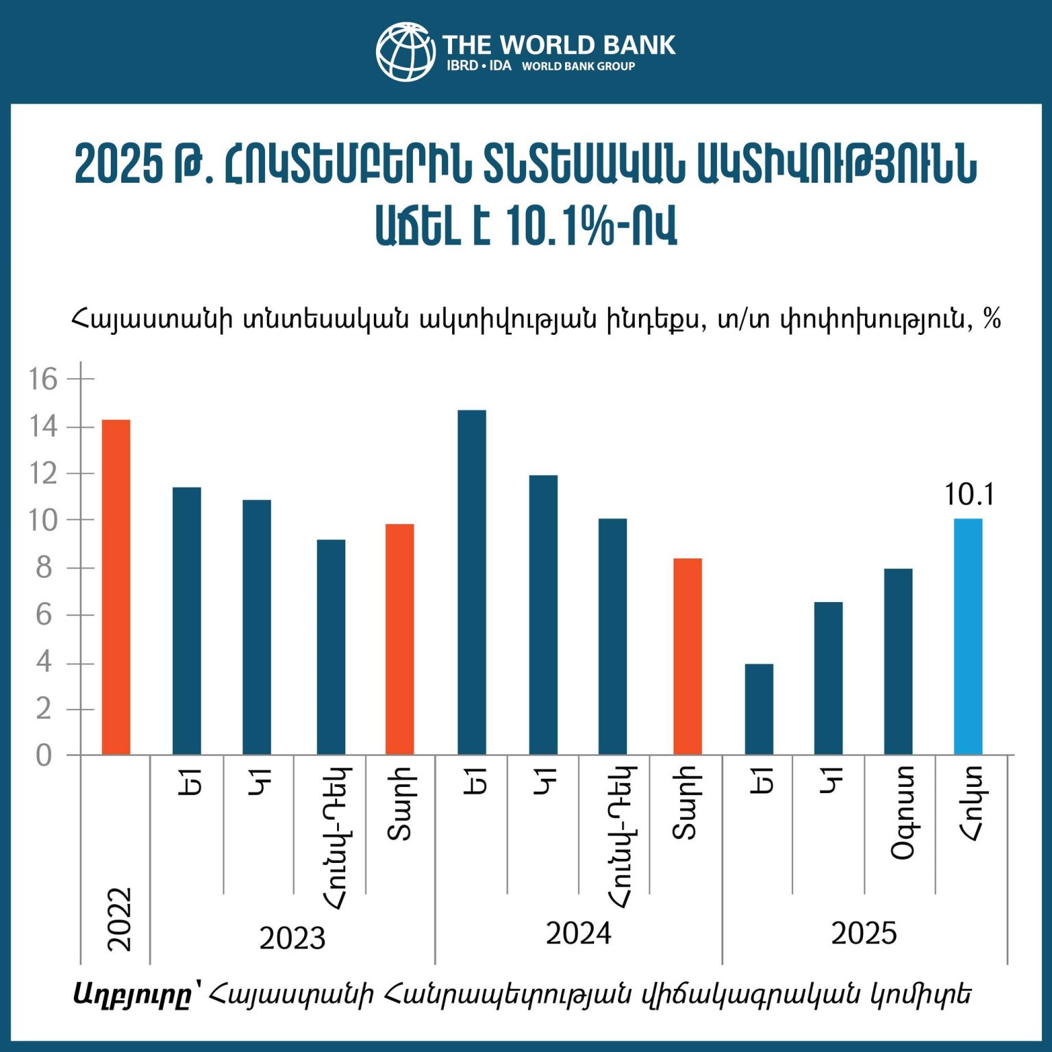Հայաստանում հոկտեմբերին տնտեսական ակտիվությունը բարձրացել է մինչև 10.1%` շինարարության և մշակող արդյունաբերության շնորհիվ․ «Համաշխարհային բանկ Հայաստան»