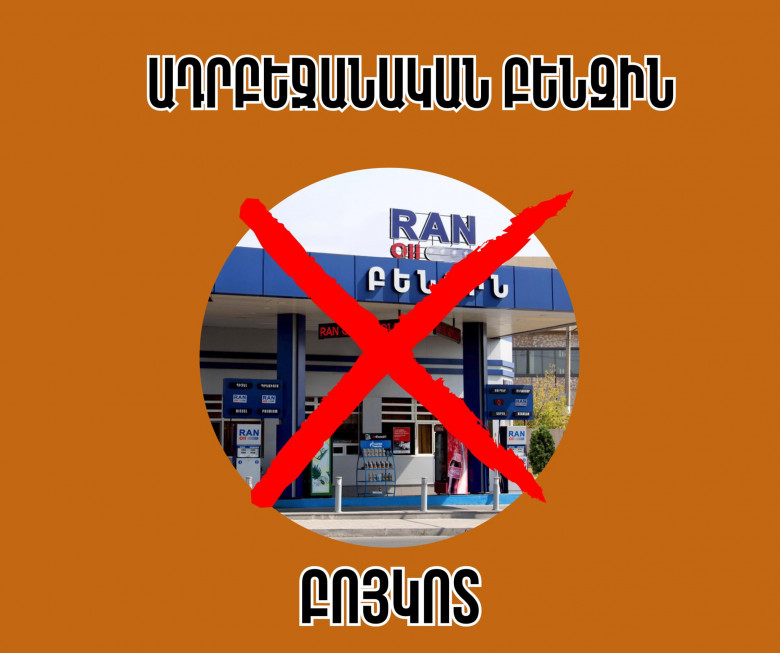 Կոչ ենք անում բոլոր վարորդներին՝ դրսևորել քաղաքացիական բարձր գիտակցություն և ավտոմեքենաները չլիցքավորել RAN Oil բենզալցակայաններում, քանի որ դրանցում վաճառվում է ադրբեջանական բենզին, որը Բաքվի բռնապետ Ալիևը վաճառում է մեզ՝ փորձելով պատրանք ստեղծել, թե իբր խաղաղություն է ցանկանում։ Իրականում բռնապետ Ալիևը մեծ քանակի սպառազինություն է կուտակում, բանտերում խոշտանգում է մեր հայրենակիցներին և պատրաստվում նոր ագրեսիայի Հայաստանի դեմ։