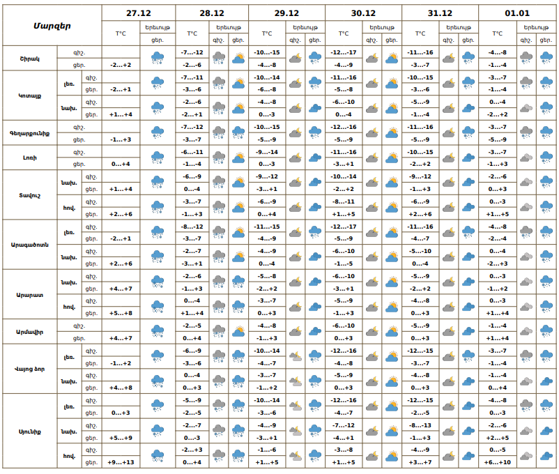 Դեկտեմբերի 27-ի ցերեկը, 28-ի գիշերը և առավոտյան շրջանների մեծ մասում, դեկտեմբերի 28-ի, 29-ի և 31-ի ցերեկը, հունվարի 1-ին առանձին շրջաններում սպասվում է ձյուն, դեկտեմբերի 27-ի ուշ երեկոյան, 28-ին առանձին հատվածներում առատ։ Դեկտեմբերի 29-ի գիշերը, 30-ին, 31-ի գիշերը սպասվում է առանց տեղումների եղանակ։ Քամին հյուսիս-արևմտյան՝ 2-5մ/վ,