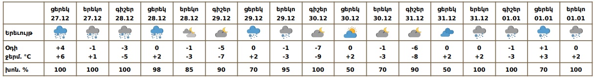 Դեկտեմբերի 27-ի ցերեկը, 28-ի գիշերը և առավոտյան սպասվում է ձյուն։ Դեկտեմբերի 28-ի և 29-ի ցերեկը, 31-ի երեկոյան, հունվարի 1-ին սպասվում են թույլ ձյուն։ Դեկտեմբերի 29-ի գիշերը, 30-ին, 31-ի գիշերը սպասվում է առանց տեղումների եղանակ: