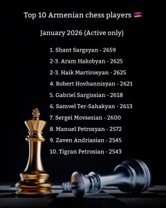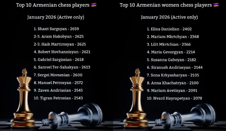 ՀԱՍԱՐԱԿՈՒԹՅՈՒՆՀայաստանի շախմատի ֆեդերացիան տեղեկացրել է՝ ովքեր են Հայաստանի 10 լավագույն շախմատիստները և շախմատիստուհիները 2026 թվականի հունվարի 1-ի դրությամբ: