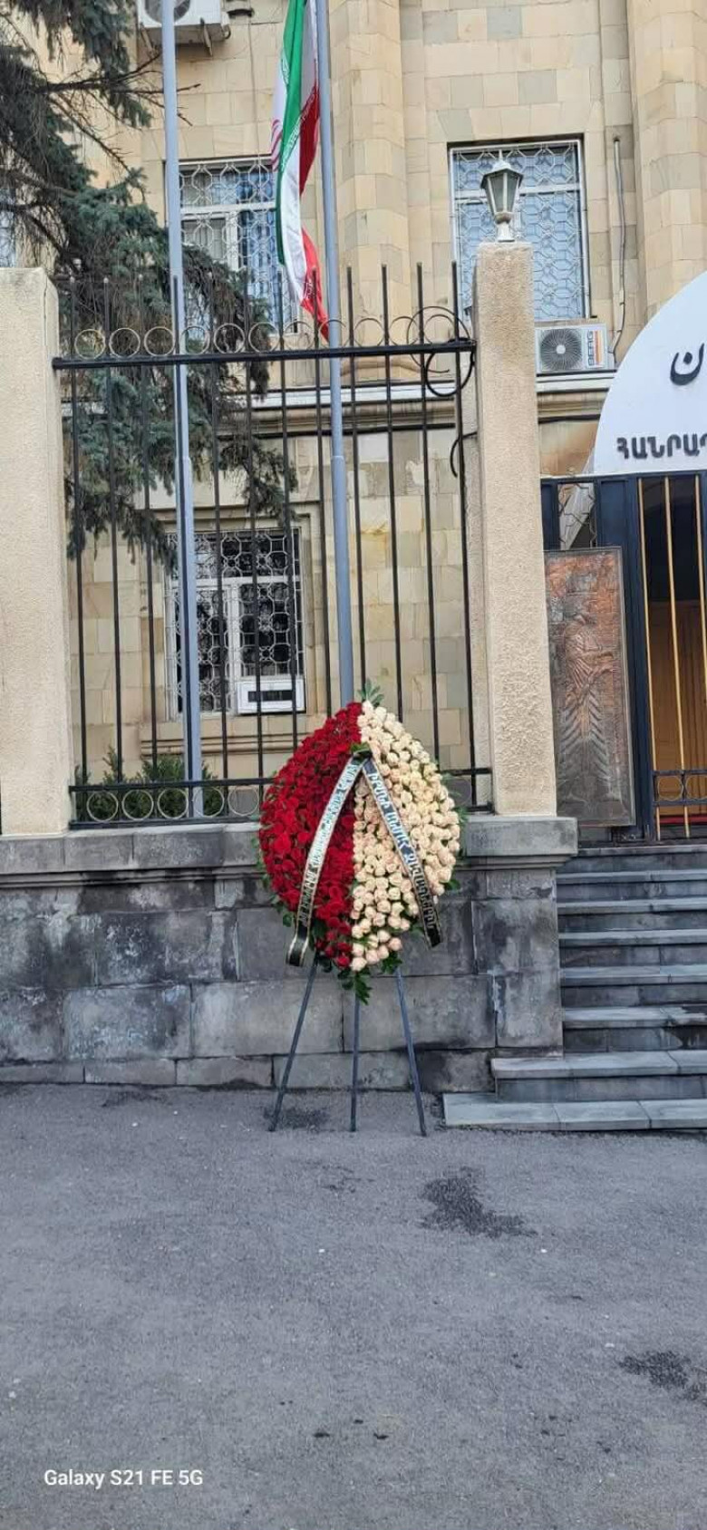 Այսօր վաղ առավոտյան «Իմ երկիր, իմ Հայաստան» հասարակական-քաղաքական շարժման կողմից ծաղկեպսակ է դրվել Հայաստանում Իրանի դեսպանատան առջև, ի նշան հարգանքի և համատեղ սգի։