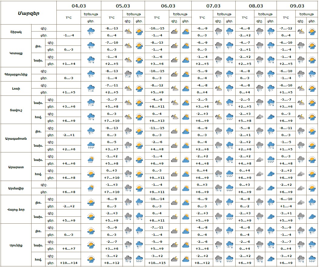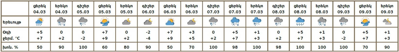 Մարտի 5-ին, 7-9-ին առանձին շրջաններում սպասվում են տեղումներ․ լեռնային և նախալեռնային շրջաններում ձյան, հովտային շրջաններում ձնախառն անձրևի և անձրևի տեսքով։ Լեռնային շրջաններում սպասվում է նաև բուք, ցածր հորիզոնական տեսանելիություն։ Մարտի 5-ի գիշերը և առավոտյան ժամերին հանրապետության առանձին ավտոճանապարհներին սպասվում է մերկասառույց։ Մարտի 6-ին սպասվում է առանց տեղումների եղանակ։ Քամին`հյուսիսարևմտյան` 2-5 մ/վ, մարտի 6-ին առանձին շրջաններում սպասվում է քամու ուժգնացում՝ 13-16մ/վ արագությամբ։ Օդի ջերմաստիճանն էապես չի փոխվի։