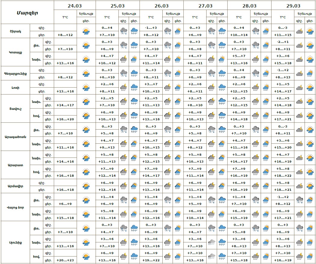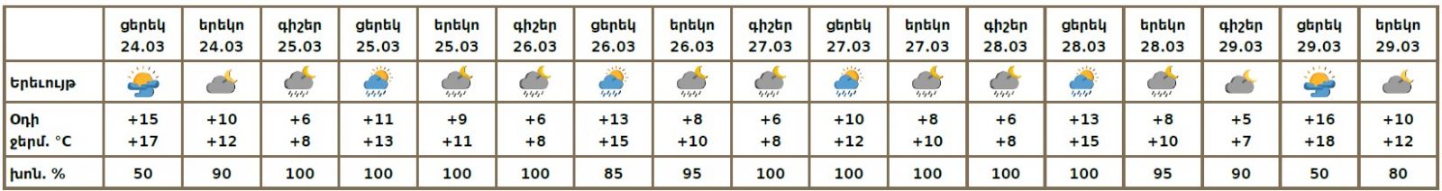 Մարտի 25-28-ին շրջանների մեծ մասում ժամանակ առ ժամանակ, 29-ին առանձին շրջաններում սպասվում են տեղումներ. լեռնային գոտիներում՝ թաց ձյան, նախալեռնային և հովտային գոտիներում՝ անձրևի տեսքով։