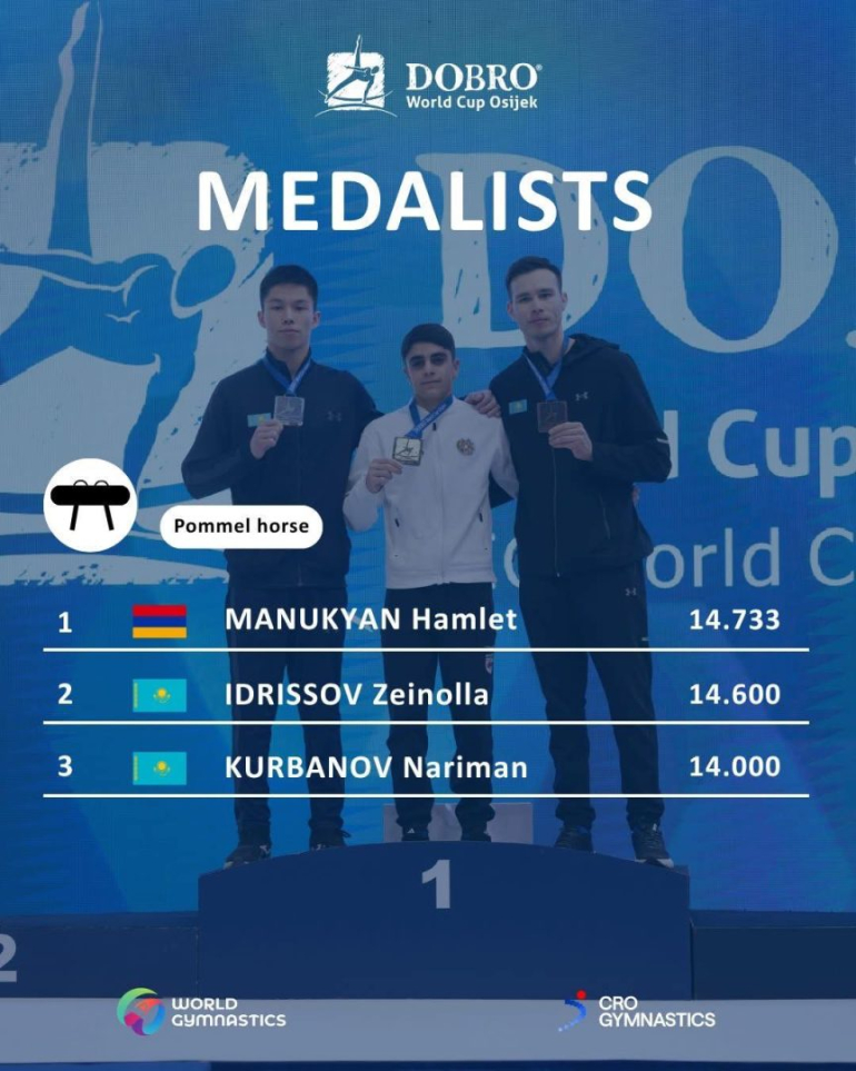 Խորվաթական Օսիյեկ քաղաքում ընթացող աշխարհի գավաթի խաղարկության հերթական փուլի նժույգ-թափերի վարժության եզրափակիչում` Համլետ Մանուկյանը հավաքելով 14.733 միավոր, կրկին առաջին հորիզոնականում է, ինչպես նախորդ` Եգիպտոսում կայացած խաղարկության ժամանակ: