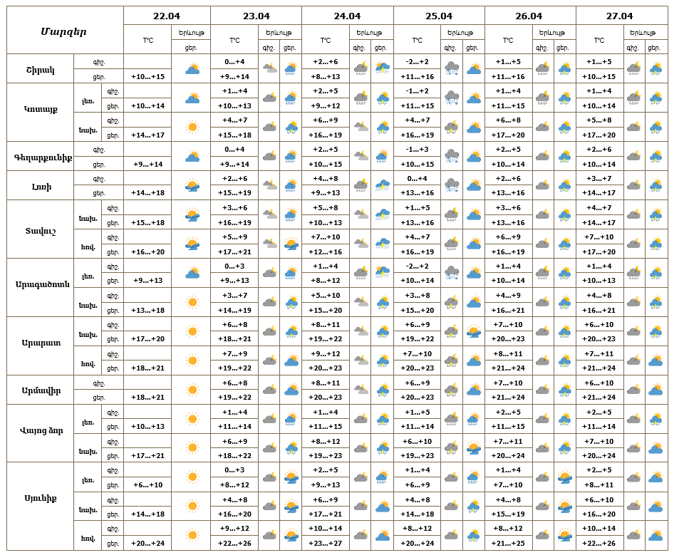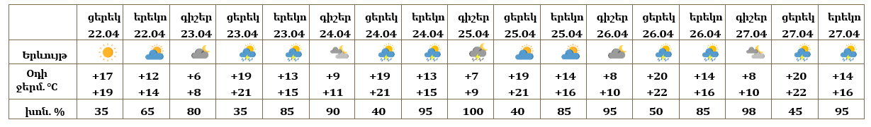 Ապրիլի 25-ի ցերեկը, 23-24-ի և 26-27-ի գիշերային ժամերին սպասվում է առանց տեղումների եղանակ։ Ապրիլի 23-24-ը, 26-27-ի կեսօրից, 25-ի գիշերը սպասվում է անձրև և ամպրոպ, ամպրոպի ժամանակ՝ քամու ուժգնացում՝ մինչև 16-19 մ/վ արագությամբ։
