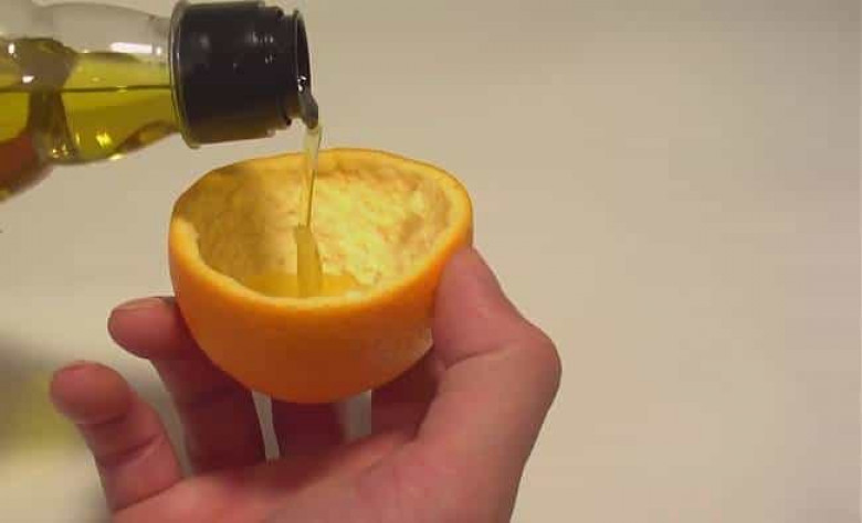 Վերցրեք մեկ նարինջ, կտրեք այն երկու մասի, ապա հեռացրեք միջուկն այնպես, որ կեղևն ամբողջական մնա։ Լցրեք դրա մեջ ձիթապտղի յուղ և վառեք սպիտակավուն հատվածը։ Ուշադրություն՝ սովորական ձեթը, կարագը կամ այլ տեսակի ձեթեր կարող են բռնկվել, օգտագործեք միայն ձիթապտղի յուղ։