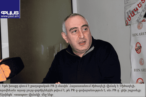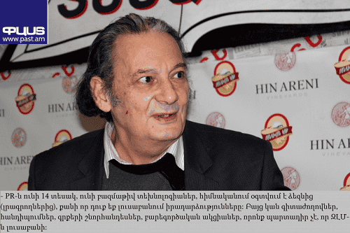 ՔԱՂԱՔԱԿԱՆԱյսօր «Տեսակետ» մամուլի ակումբի հյուրեր քաղաքական տեխնոլոգ Կարեն Քոչարյանը եւ սոցիոլոգ Ահարոն Ադիբեկյանը խոսեցին PR երեւույթի մասին, Հայաստանում քաղաքական PR-ի լինել-չլինելու վերաբերյալ: Ըստ Ահարոն Ադիբեկյանի՝ Հայաստանում քաղաքական-սոցիալական տեղեկատվության 25 տոկոսը շուրթից շուրթ է գնում: Նա նաեւ նշեց, որ օտարերկրացիների մոտ հայերը միայն Եղեռնի հետ են ասոցացվում, լավագույն դեպքում հիշում են Արամ Խաչատրյանին եւ Շառլ Ազնավուրին: