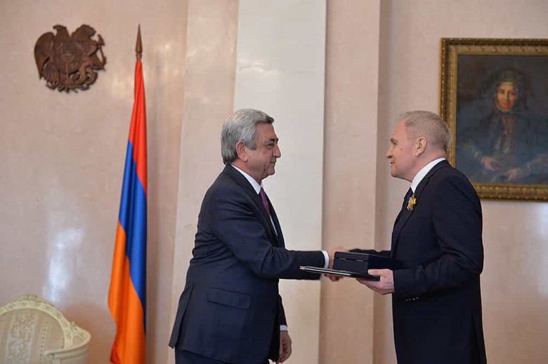 Նույն օրը Հայաստանի Հանրապետության դեսպանությունում ՀՀ Նախագահի մասնակցությամբ տեղի է ունեցել պարգևատրման արարողություն: Հայ-ռուսական բարեկամական կապերի ամրապնդման և զարգացման գործում ներդրած նշանակալի ավանդի, ինչպես նաև սահմանադրական արդարադատության ոլորտում բազմամյա և արդյունավետ համագործակցության համար Ռուսաստանի Դաշնության սահմանադրական դատարանի նախագահ Վալերի Դմիտրիի Զորկինին Նախագահ Սերժ Սարգսյանը պարգևատրել է Բարեկամության շքանշանով: ՀՀ Նախագահի կողմից նույն բարձր պարգևին են արժանացել նաև Ռուսաստանի Դաշնության գլխավոր դատախազ Յուրի Յակովի Չայկան և Ռուսաստանի Դաշնության քննչական կոմիտեի նախագահ Ալեքսանդր Իվանի Բաստրիկինը` Հայաստանի Հանրապետության և Ռուսաստանի Դաշնության իրավապահ մարմինների համագործակցության խորացման, հայ-ռուսական բարեկամական կապերի ամրապնդման ու զարգացման գործում ներդրած նշանակալի ավանդի համար: