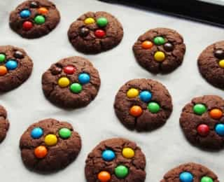 - Ստացված խմորից պատրաստում ենք փոքրիկ գնդիկներ, մի փոքր սեղմում, տալով թխվածքաբլիթի ձև, վրան զարդարում ենք M&M's կոնֆետներով և դնում պերգամենտային թղթով պատած տապակի վրա ու թխում ջեռոցում 15 րոպե 180 աստիճանում: