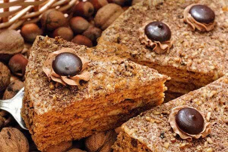Նախապես տաքացնել ջեռոցը 200 աստիճան: Ձվերը հարիչով հարել շաքարավազի հետ՝ մինչև սպիտակեն: Ավելացնել մեղրը, սոդան, ընկույզը՝ յուրաքանչյուրը լցնելուց հետո հարելով: Վերջում ավելացնել ալյուրը, փայտյա գդալով խառնել: Ջեռոցի քառանկյուն տապակի մեջ յուղաթուղթ դնել, լավ պատել բուսայուղով, ստացված խմորը մտովի բաժանել 3 մասի, քանի որ պետք է 3 շերտ թխել: Խմորը լցնել տապակի մեջ, գդալի օգնությամբ տարածել և թխել, պետք է նշել, որ շատ արագ է թխվում, ուստի թողնել այնքան՝ մինչև կարմրի, հանել և անմիջապես շրջել որևէ մատուցարանի կամ հարթ տարայի վրա: Այսպես 3 անգամ: Կրեմ - Լավ հարել կարագը, քիչ-քիչ ավելացնել եփած խտացրած կաթը, վանիլինը: Կրեմը քսել շերտերի վրա, վերջում վրան մանրացրած ընկույզ կամ քերած շոկոլադ լցնել, ծածկել և թողնել մի քանի ժամ, որ կրեմը ծծվի և փափկի: