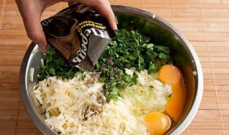 Սոխը, կարտոֆիը, դդմիկը, պանիրը անցկացնել խոշոր քերիչով: Մանրեցնել սխտորը և կանաչին: Համեմել համեմունքներով, ավելացնել ձու: Վերջում ավելացնել ալյուր: Թավայի մեջ լցնել ձեթ և ճաշի գդալով տեղավորել միջուկը տալով կոտլետի տեսք:
