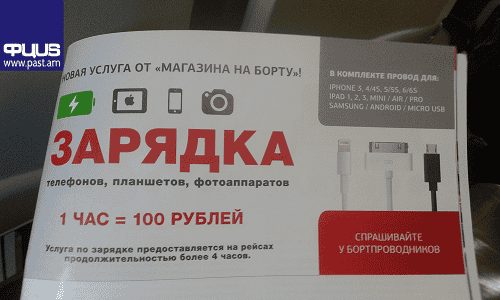 Ավիաընկերությունները նոր ծառայություն են առաջարկում իրենց ուղեւորներին՝ վճարովի կարգով հեռախոսի, պլանշետի ու ֆոտոխցիկների մարտկոցի լիցքավորում են իրականացնում: Մեկ ժամ լիցքավորումը կարժենա 100 ռուբլի, այսինքն՝ 700 դրամ:
