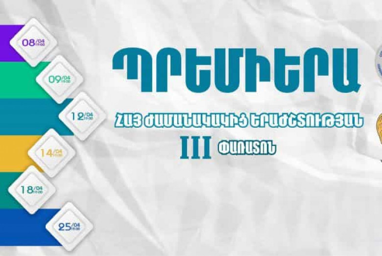 ՀԱՍԱՐԱԿՈՒԹՅՈՒՆՀայ ժամանակակից երաժշտության փառատոնի ընթացքում կհնչեն 40 կոմպոզիտորների ստեղծագործություններ: Այս մասին«Արմենպրես»-ին տեղեկացրին Հայաստանի կոմպոզիտորների միությունից: Փառատոնային 6 համերգների ընթացքում երաժշտասեր հանրությունը կունկնդրի ինչպես սիմֆոնիկ, այնպես էլ կամերային, խմբերգային երաժշտություն: &laqu o;Պրեմիերա» խորագիրը կրող փառատոնն իր ձևաչափով առանձնանում է նրանով, որ նախագծի ընթացքում ստեղծագորւթյունների մեծ մասը կկատարվեն առաջին անգամ, իսկ հայ կոմպոզիտորների ստեղծագործությունները կհնչեն Հայաստանի ազգային ֆիլհարմոնիկ, Հայաստանի պետական երիտասարդական, Ալ. Սպենդիարյանի անվան օպերայի և բալետի ազգային ակադեմիական թատրոնի նվագախմբերի, Հայաստանի պետական կամերային, Երևանի պետական կամերային երգչախմբերի, ինչպես նաև առաջատար երաժշտական խմբերի ու մենակատարների կատարմամբ: Ժամանակակից երաժշտության թվով երրորդ փառատոնը կմեկնարկ ի ապրիլի 8-ին՝ Արամ Խաչատրյան համերգասրահում: Փառատոնային մեկ համերգ էլ կնվիրվի տարվա հոբելյաններին: