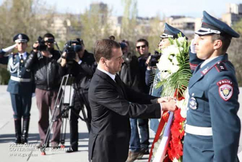 Ինչպես «Արմենպրես»-ին տեղեկացրին ՀՀ կառավարության տեղեկատվության և հասարակայնության հետ կապերի վարչությունից, ՌԴ վարչապետը ծաղիկներ է խոնարհել անմար կրակի մոտ և մեկ րոպե լռությամբ հարգանքի տուրք մատուցել Հայոց մեծ եղեռնի զոհերի հիշատակին: Այնուհետև Դմիտրի Մեդվեդևը եղել է «Հիշողության» պուրակում և ջրել 2008 թվականին իր տնկած եղևնին: