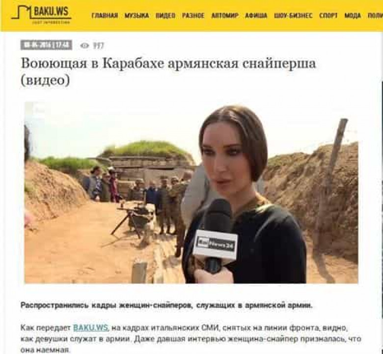Ադրբեջանական կայքերից մեկը գրել է, որ իտալական ԶԼՄ-ների նկարահանած տեսանյութում հստակ երևում է, թե ինչպես են հայ աղջիկները ծառայում բանակում։ Նույնիսկ նրանցից մեկը «խոստովանել» է, որ վարձկան դիպուկահար է.