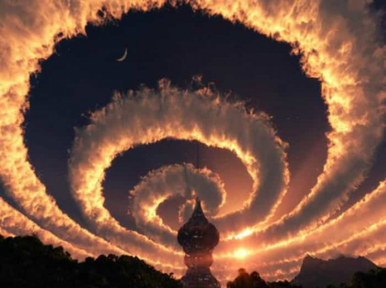 Մայրամուտի ճառագայթներով համակված պարուրաձև ամպ