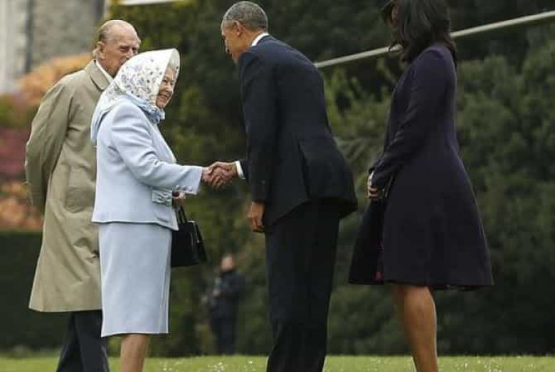 Օբաման թագուհուն շնորհավորել Է 90-ամյա հոբելյանի առթիվ: Ողջագուրումներից հետո նախագահական զույգը նստել Է սեւ «Ռեյնջ Ռովերը», որը վարել Է 94-ամյա արքայազն Ֆիլիպը: