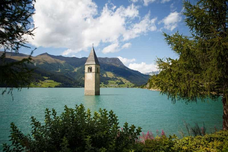 9. Ռեշենզե լճից բարձրանում է աշտարակ: Ահա այն, ինչ մնացել է ջրի տակ անցած գյուղից: