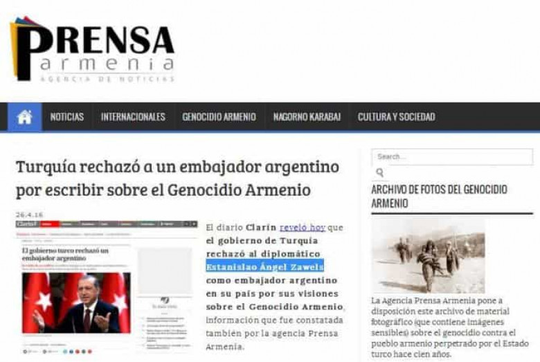 ՄԻՋԱԶԳԱՅԻՆԹուրքիան մերժել է արգենտինացի դիվանագետ Էստանիսլաու Անխել Զավելսի թեկնածությունը որպես իր երկրում Արգենտինայի դեսպան` Զավելսի կողմից Հայոց ցեղասպանության հարցում ունեցած դիրքորոշման պատճառով: Այս մասին տեղեկացնում է Prensa Armenia-ն: