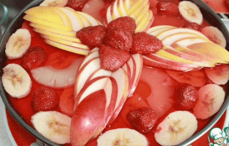 Մրգերը գեղեցիկ կտրատել, շարել ժելեի վրա։