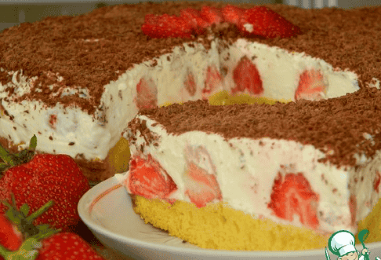 Խմորի վրա լցնել խնձորի հյութը։ քսել կրեմը, շարել ելակը, վերջում զարդարել քերած շոկոլադով։