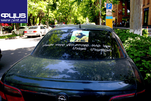 ՖՈՏՈՀայաստանի եւ Արցախի ազգային հերոս Մոնթե Մելքոնյանի լուսանկարն ու խոսքերը՝ ավտոմեքենայի ետնապակուն փակցված: