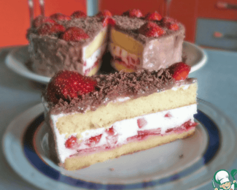 Հանել սառնարանից տորթը, վերին շերտին լցնել շոկոլադե զանգվածը, զարդարել քերած շոկոլադով ու ելակով։