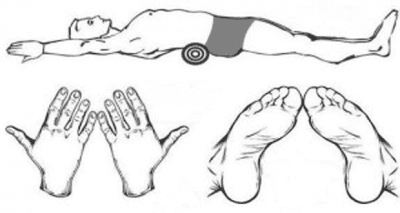 Այս վիճակով օրական 3 անգամ պառկեք հարթ մակերևույթի վրա` 5 րոպեով: Այդ ընթացքում այնպես արեք, որպեսզի ոտքերի բութ մատներն ու ձեռքերի ճկույթներն իրար կպած լինեն: Անհրաժեշտ է, որպեսզի ձեռքերն ափերի հատվածով դրված լինեն հատակին: