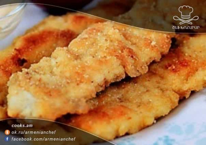 - Մեկ ամանի մեջ ենք լցնում ալյուրը, աղն (մոտ 1/2 թ/գդ) ու պղպեղը։ Մեկ այլ ամանի մեջ ենք լցնում 2 հատ ձուն, հարում ենք։ Երրորդ ամանի մեջ ենք լցնում պաքսիմատը։