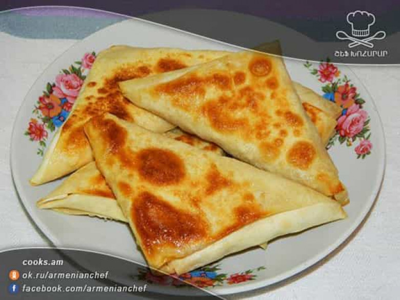 - Դնում ենք բուսայուղով շիկացած թավայի մեջ` ծալած հատվածով դեպի ներքև։ Երկու կողմից տապակում ենք մինչև կարմրեն։