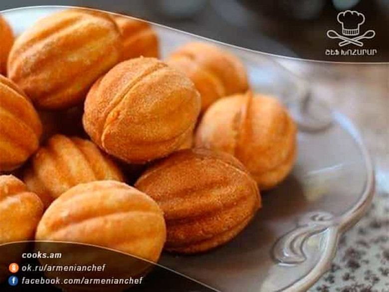 - Պատրաստի թխվածքաբլիթների ավելորդ հատվածները կտրում ենք, փշրում և լցնում խտացրած կաթի մեջ (կարող ենք նաև մանրացված ընկույզ լցնել)։ Ստացված կրեմը լցոնում ենք ընկույզների մեջ և դրանք զույգերով միացնում ենք` ամբողջական ընկույզ ձևավորելով։
