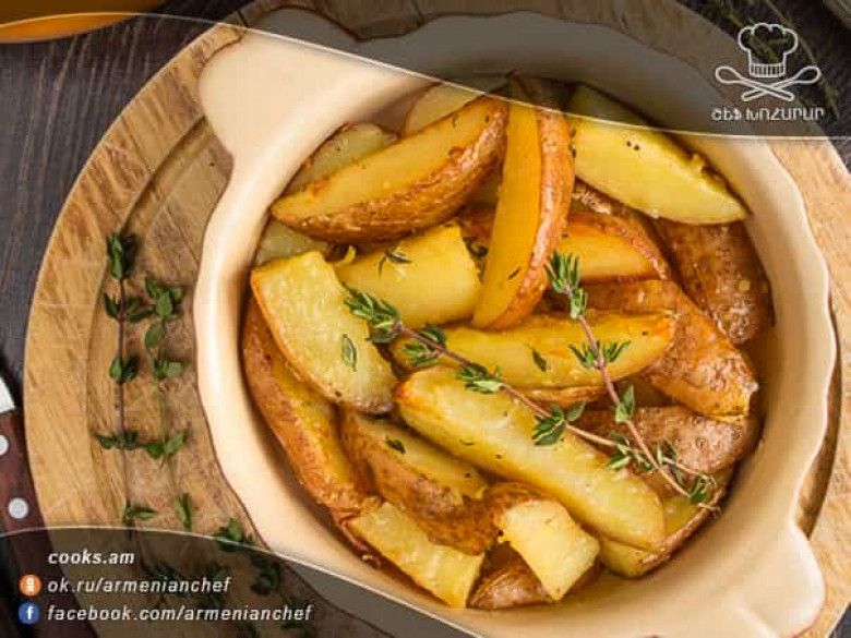 - Տեղափոխում ենք նախապես մինչև 200 աստիճան տաքացրած ջեռոցը և, պարբերաբար խառնելով, մոտ 45-60 րոպե եփում ենք մինչև կարտոֆիլը փափկի։