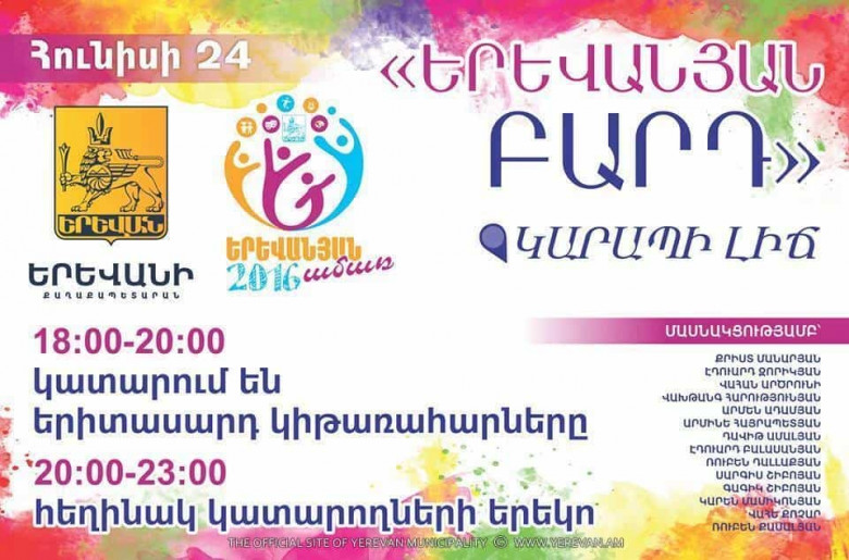 վաղը՝ հունիսի 24-ին, «Երևանյան ամառ 2016» եռամսյա միջոցառումների ծրագրի շրջանակում, ժամը 18:00-ից Կարապի լճի հարակից տարածքում կմեկնարկի «Երևանյան բարդ» հեղինակ կատարողների բացօթյա համերգային երեկոն։ Համերգին ելույթ կունենան երիտասարդ կիթառահարներ, ինչպես նաև հայտնի հեղինակ-կատարողներ: