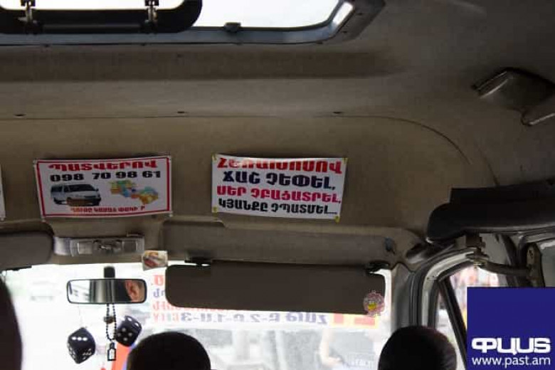 ՖՈՏՈԵրեւան քաղաքի երթուղային տաքսիներից մեկի առաստաղին փակցված գրությունների միջոցով վարորդը տեղեկացնում է, որ հղի կանայք երթեւեկում են անվճար։ Բացի այդ, խնդրում է երթեւեկության ընթացքում հեռախոսով ճաշ եփելը չբացատրել ու նաեւ սեր չխոստովանել։
