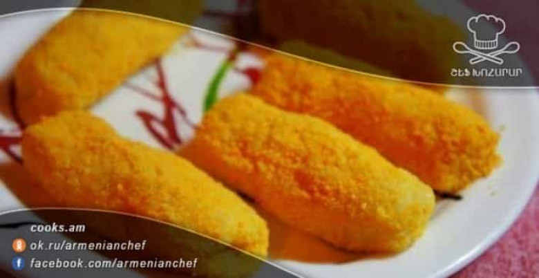 - Թաց ձեռքերով կարտոֆիլային խյուսից պատրաստում ենք ձողիկներ, մեջտեղը դնում մեկական պանրի կտոր ու թաթախում պաքսիմատի մեջ: Ստացված ձողիկները տապակում ենք բոլոր կողմերից ձիթայուղի մեջ մինչև պաքսիմատի ոսկեգույն դառնալը: