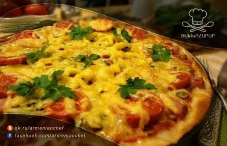 - Պիցցան տեղադրեք նախապես 220աստիճան տաքացրած ջեռոցում և եփեք 15-20րոպե: