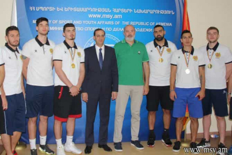 ՍՊՈՐՏՀուլիսի 6-ին ՀՀ սպորտի և երիտասարդության հարցերի նախարարության դահլիճում ՀՀ սպորտի և երիտասարդության հարցերի նախարար Գաբրիել Ղազարյանը ՀՀ միջազգային սպորտի վարպետի կոչումներ է շնորհել և համանուն կրծքանշանով պարգևատրվել Եվրոպայի փոքր երկրների առաջնությունում հաղթած, բասկետբոլի Հայաստանի Հանրապետության հավաքականի թիմի անդամներին:Նախարարը հավաքական թիմի գլխավոր մարզչի՝ Տիգրան Գյոկչյանին շնորհել է Ֆիզիկական կուլտուրայի և սպորտի պատվավոր աշխատողի կոչում և պարգևատրել է համանուն կրծքանշանով: Ողջունելով ներկաներին և շնորհավորելով 2016 թվականի Եվրոպայի փոքր երկրների առաջնության չեմպիոն դառնալու կապակցությամբ նախարար Ղազարյանն ասել է. «Շնորհակալություն եմ ուզում հայտնել այն բանի համար, որ Դուք բարձր պահեցիք ՀՀ դրոշը: Ամբողջ հայ ազգը հպարտ է Ձեր հաղթանակով: Այս ձեռքբերումը համառ և քրտնաջան աշխատանքի արդյունք է: Այն լինելու է շարունակական, չենք բավարարելու եղածով. դեռ շատ աշխատանք ունենք անելու»: Գաբրիել Ղազարյանը հատուկ շնորհակալությու ն է հայտնել թիմի գլխավոր մարզչ Տիգրան Գյորկչյանին կատարած աշխատանքի համար: