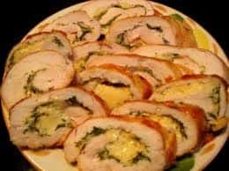 Հավի ֆիլեի մեջ տեղադրել սնկեր և պանրի խորանարդիկը, ռուլետի նման փաթաթել, այնուհետև երկու շերտերով փաթաթել խոզապուխտը: Հավիլ ֆիլեի մնացած կտորներն էլ այդպես պատրաստել: Դնել ջեռոցում 180 աստիճանի տակ 30 րոպե: