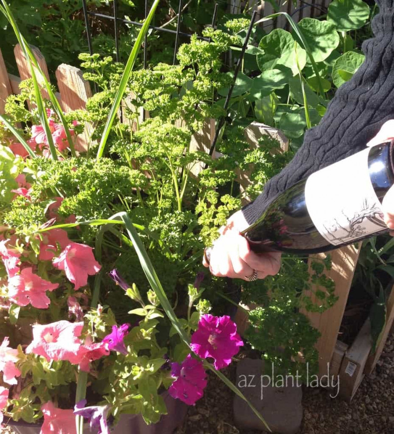 Ուղղակի գինու շիշը մինչև վերջ լցրեք ջրով, ապա մատով փակեք շիշը և արագ շրջելով մոտ 5 սմ խորությամբ մտցրեք հողի մեջ: Եթե շիշը շատ մեծ է բույսի համար, ապա շշի վրա կափարիչ ամրացրեք և փոքրիկ անցք բացեք դրա վրա: Ավելի գեղեցիկ տեսք տալու համար կարող եք ներկել շիշը և հետաքրքիր պատկերներ նկարել:
