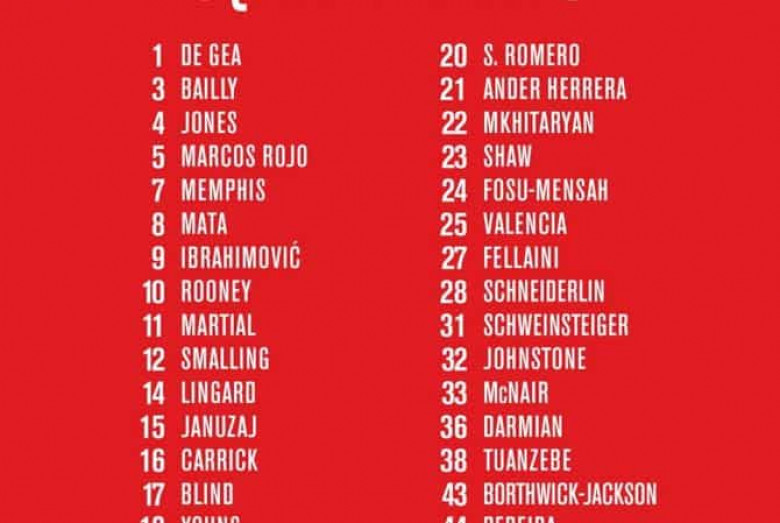1.Դավիդ Դե Խեա, 3. Էրիկ Բայի, 4. Ֆիլ Ջոնս, 5. Մարկոս Ռոխո, 7. Մեմֆիս Դեպայ, 8. Խուան Մատա, 9. Զլատան Իբրահիմովիչ, 10. Ուեյն Ռունի, 11. Անտոնի Մարսիալ, 12. Քրիս Սմոլինգ, 14. Ջեսի Լինգարդ, 15. Ադնան Յանուզայ, 16.Մայքլ Քարիկ, 17. Դեյլի Բլինդ, 18. Էշլի Յանգ, 19. Մարկուս Ռեշֆորդ, 20. Սերխիո Ռոմերո, 21. Անդեր Հերերա, 22. Հենրիխ Մխիթարյան, 23. Լյուկ Շոու, 24. Թիմոթի Ֆոնսու Մենսա, 25. Անտոնիո Վալենսիա, 27. Մաուրան Ֆելաինի, 28. Մորգան Շնայդերլին, 31. Բաստիան Շվայնշտայգեր, 32. Սեմ Ջոնսթոն, 33. Պատրիկ Մակնեիր, 36. Մատեո Դարմիան, 38. Աքսել Տուանզեբե, 43. Քեմերոն Բրոտվիկ Ջեքսոն, 44. Անդրեաս Պերեիրա, 48. Ուիլ Քեյն:.