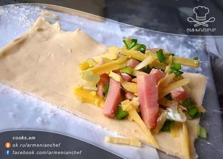 - Խմորը գրտնակում ենք և ուղղանկյունաձև կտրատում` 6x12 չափի ։ Ուղղանկյունաձև կտրած խմորի մի կեսի վրա լցնում ենք 1-ական գդալ միջուկ։