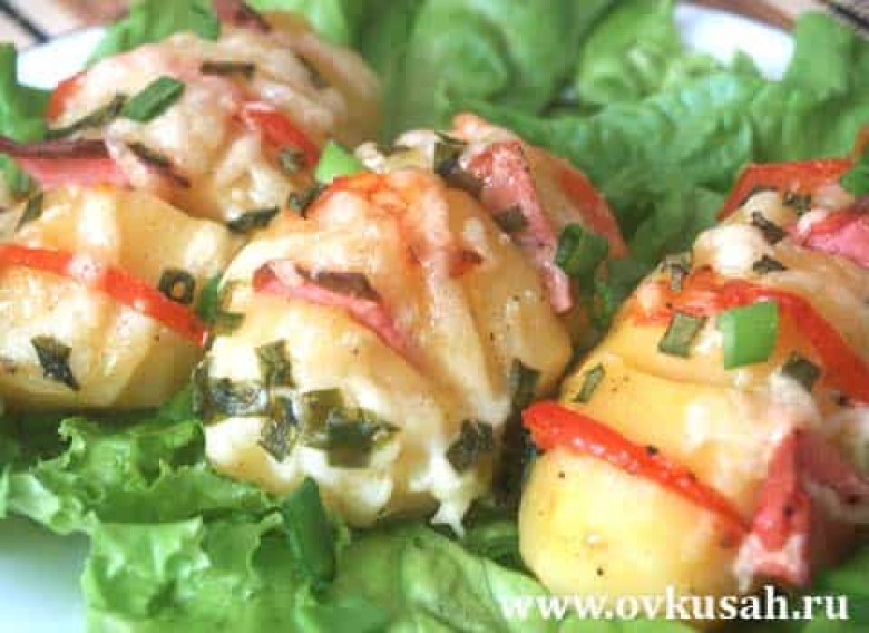 Կարտոֆիլը կիսել, համեմել պղպեղով, վրան քսել թթվասեր, դնել կտրատած լոլիկ ու տապակած սոխ։
