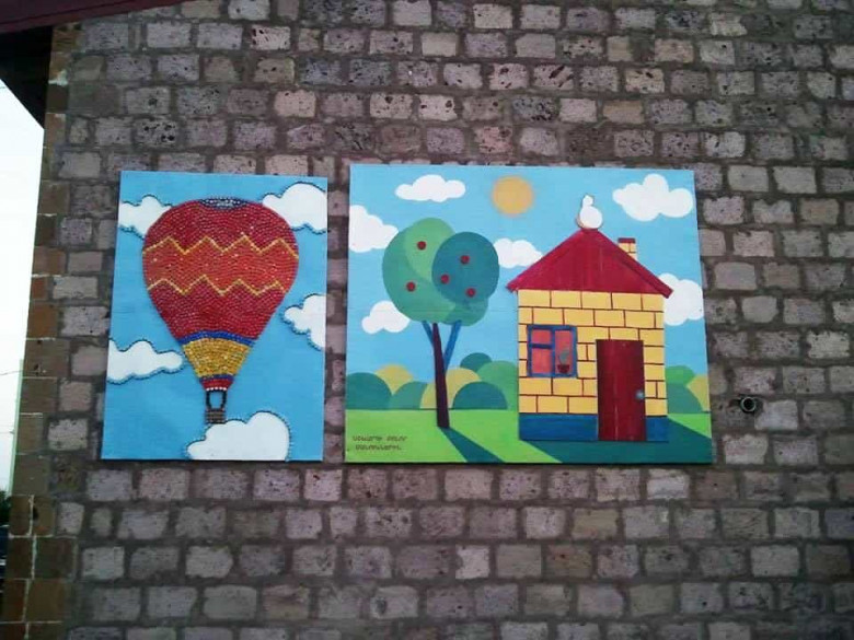 «Գլուխգործոցները կոնկրետ անուններ չունեն, բայց ունեն բացատրություններ՝ երազանքների օդապարիկ, երեխաների իրավունքների պաշտպանությանը նվիրված բարեկեցիկ պայմաններով տուն, սոցցանցերում հավանումներ ու ընկերներ չունեցող, գաղափարակիցներ չունեցող լացող մարդ, հաշմանդամություն ունեցող մարդկանց իրավունքների պաշտպանությանը նվիրված խճանկար՝ անվասայլակով տղա՝ ձեռքն ամուր առաջ պարզած ու ժպիտը դեմքին»,- իրենց աշխատանքների մասին պատմում է Արսենը: Սրանց մեջ թերեւս առանձնանում է գորգի տեսքով պատրաստված խճանկարը: