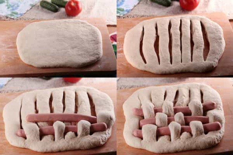 - Ստացված խմորները գալարաձև փաթաթել նրբերշիկների շուրջը: