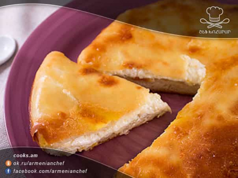 - Խմորի գնդերը 1-1.5 սմ հաստությամբ բացում ենք, վրան դնում պանրով զանգվածի գունդը, տրորում ու տարածում խմորի մակերևույթին: Հետո խմորի եզրերը վրա ենք բերում, ամրացնում ու ծածկում լցոնը: Շրջում ենք և զգուշորեն գրտնակում՝ տրամագիծը հասցնելով 20-23 սմ (խմորն ամուր է և չի պատռվում):