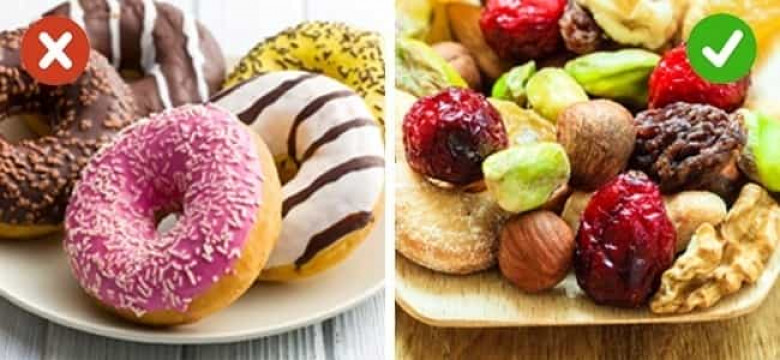 Քաղցր կոնֆետները և տորթերը փոխարինեք թարմ կամ չորացրած մրգերով և ընկուզեղենով: Այսպես դուք կարող եք ազատվել ավելորդ շաքարից և ճարպից միաժամանակ առանց քաղցրից կտրականապես հրաժարվելու: Իհարկե, պետք չէ տոննաներով միրգ ուտել. ամեն ինչն իր չափն ունի: