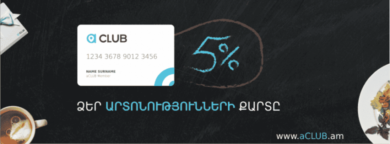 Մի հատ թույն բան եմ պալիտ արել , ուզում եմ հետներդ կիսվեմ: Մի հատ aClub քարտ կա, պատվիրում ես, քաղաքի ժամանցի վայրերում օրդ անցկացնում ես, հաշիվը փակելուց հետո տոկոսա նստում քարտիդ վրա: 4 օրվա մեջ 1000 դրամ բոնուս եմ հավաքել քարտիս վրա: